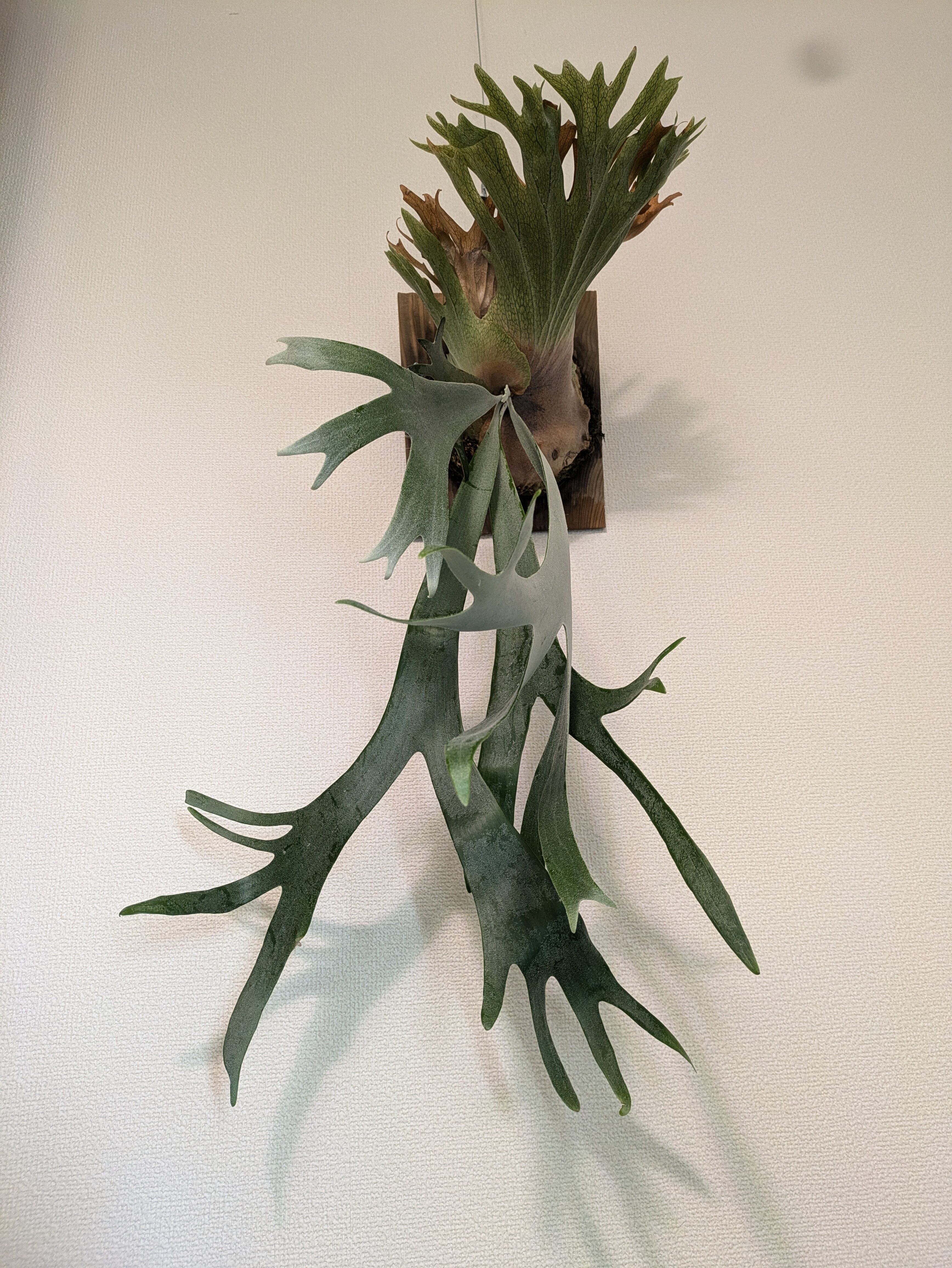 インドネシアの山で採れたワイルド個体のビカクシダです。品種名はないですが、その分、唯一無二でどんな成長を見せてくれるのか、日々の変化を楽しむことができるのがワイルド株の醍醐味です。